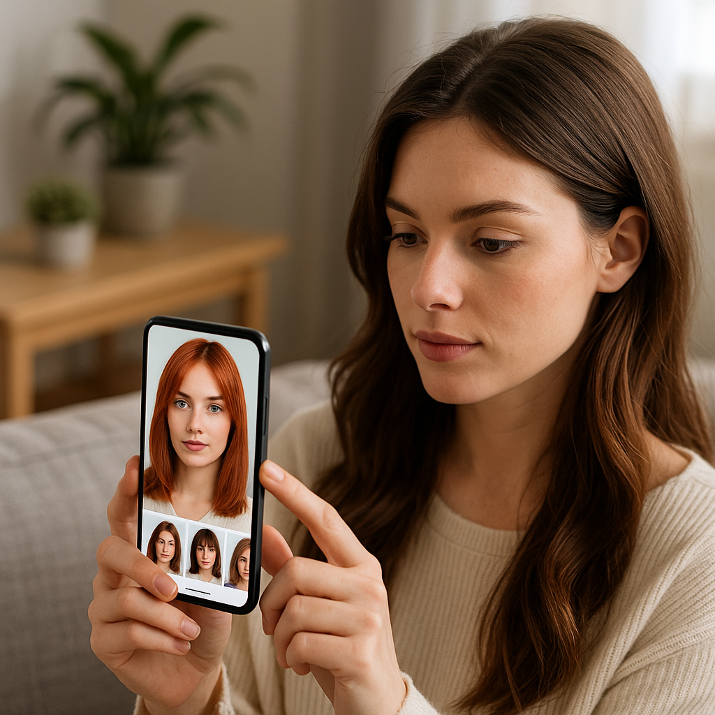 As ferramentas mais completas permitem que você experimente tanto cor quanto corte simultaneamente. Você visualiza a transformação integral, vendo exatamente como uma nova tonalidade funciona com um novo comprimento e estilo. Essa combinação oferece a simulação mais próxima do resultado real que você receberá no salão.